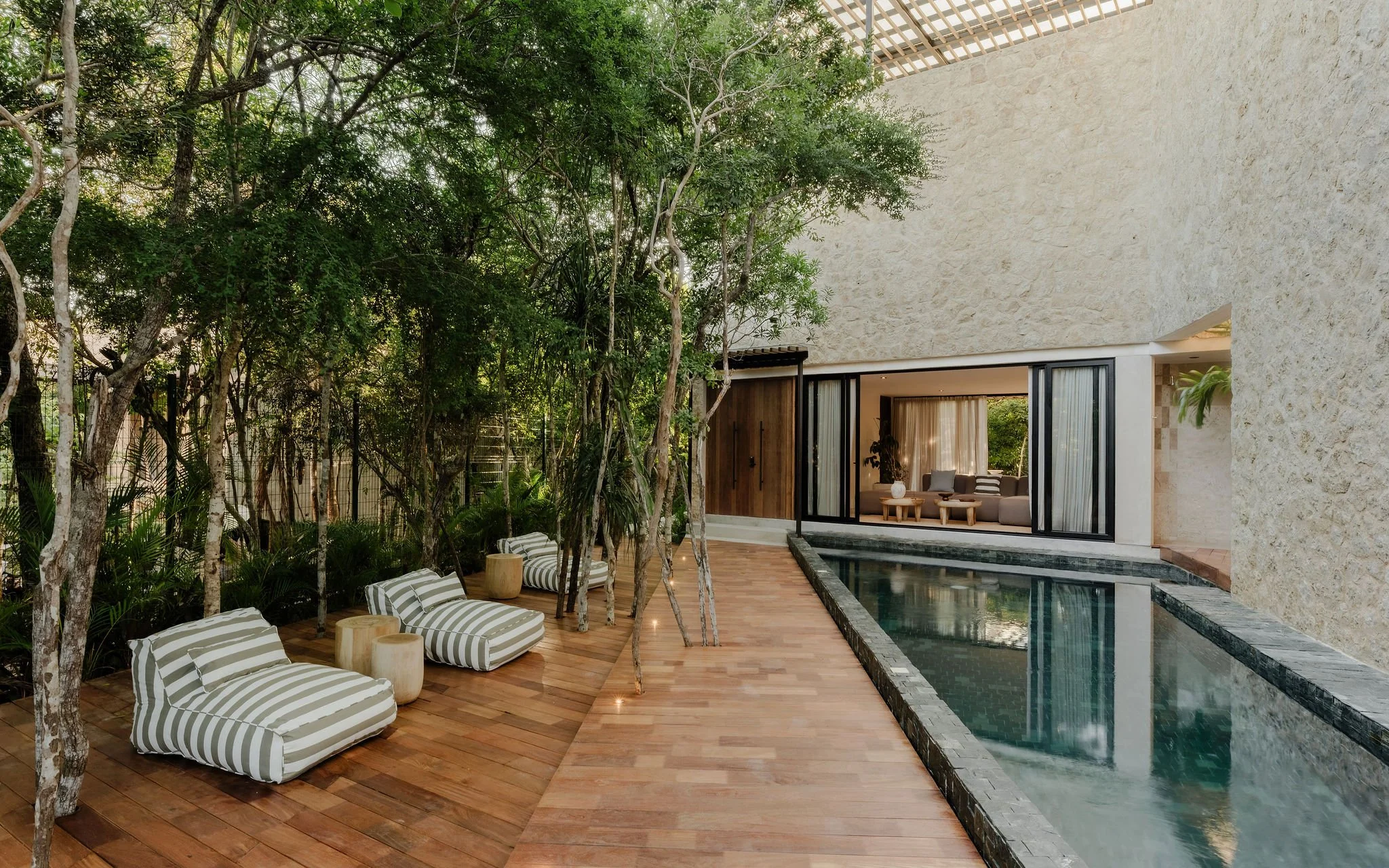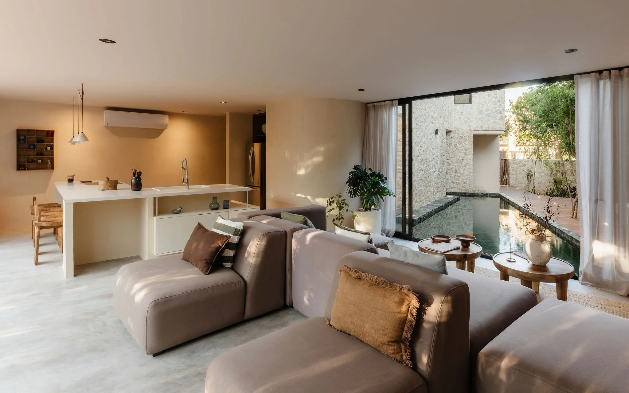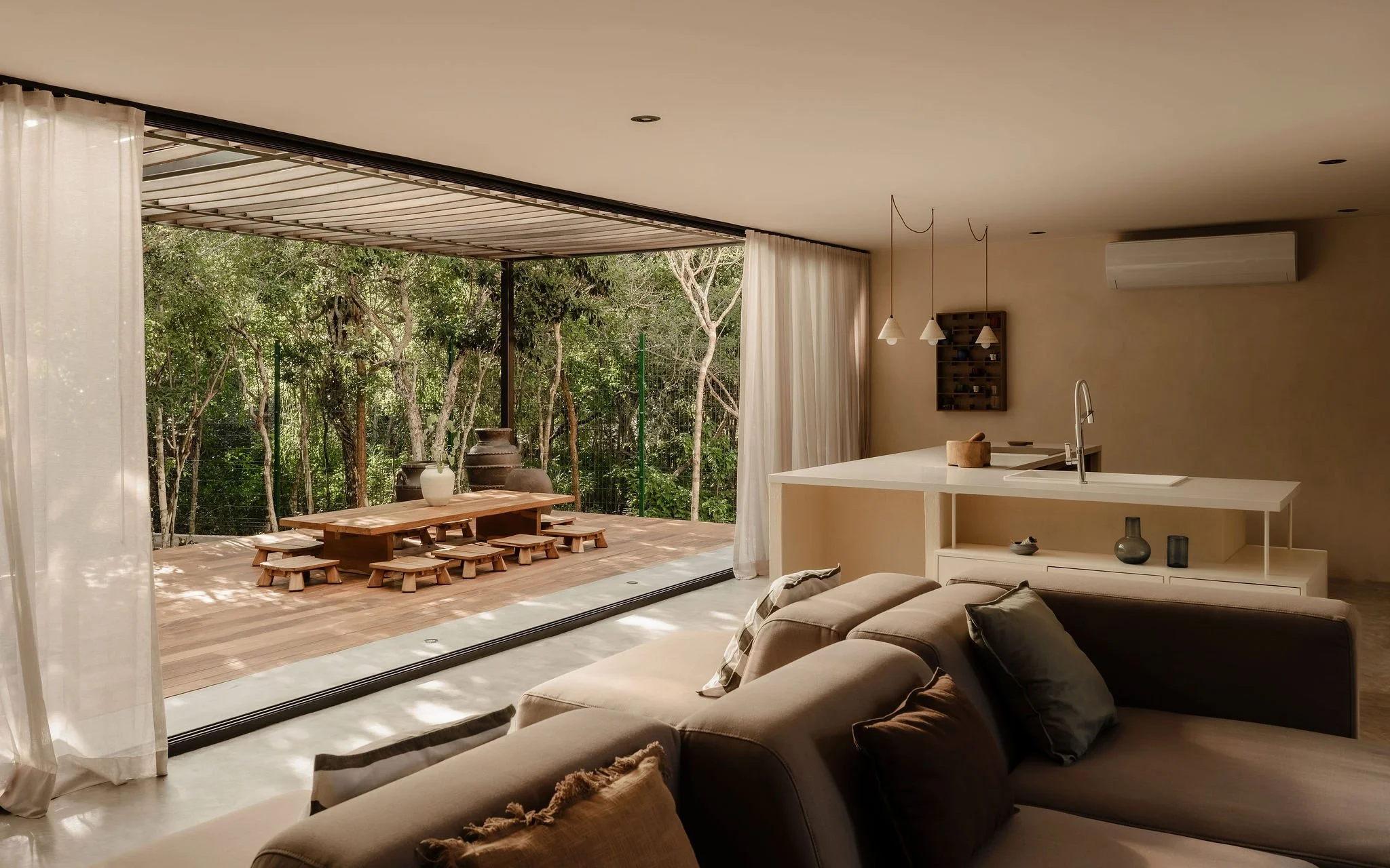 Defined by soft volumes, natural textures, and filtered light, the project dissolves boundaries between interior and exterior.