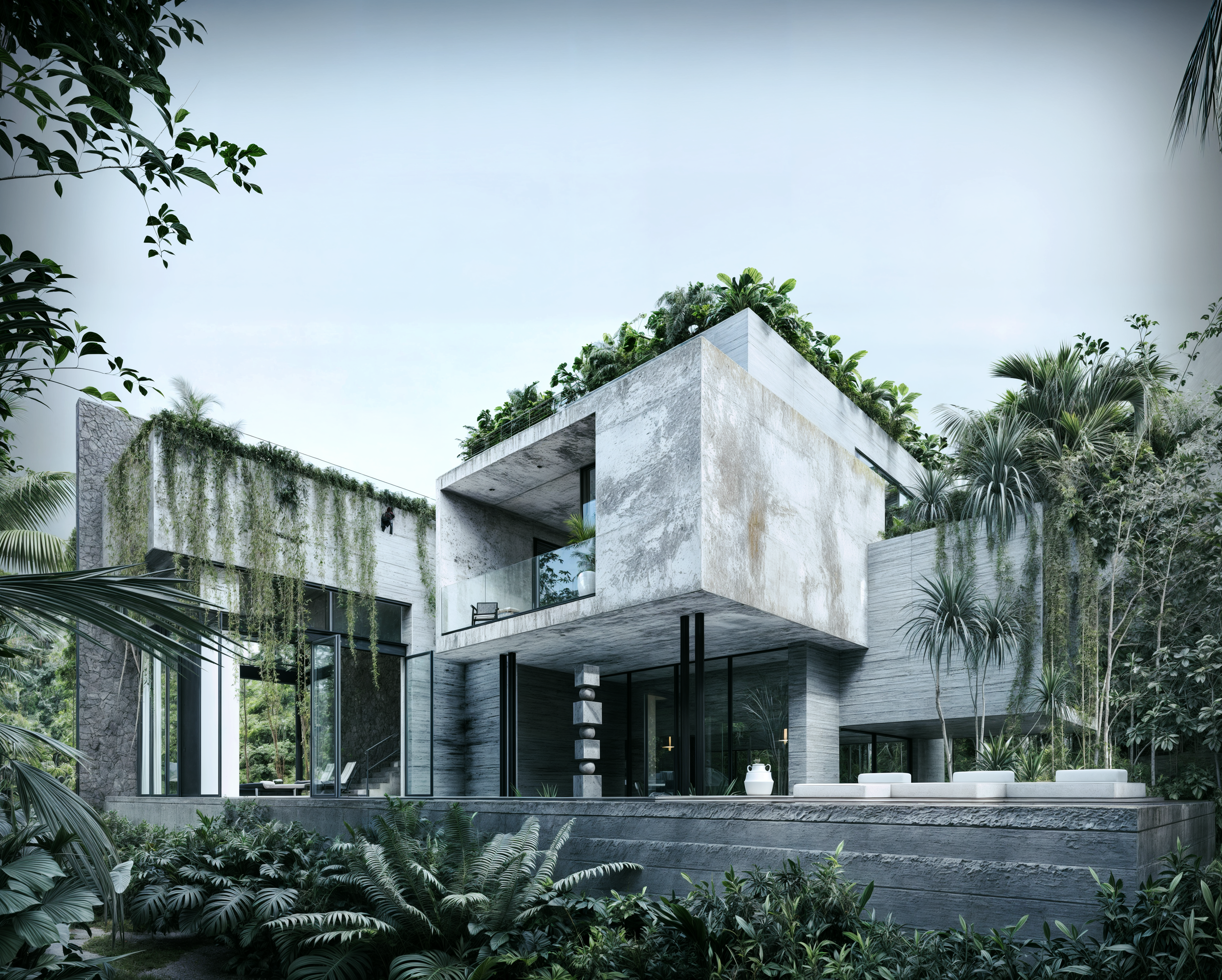 Exposed concrete volumes with strong, defined lines are gradually softened by humidity, moss, and surrounding vegetation. Reclaimed wood, oxidized steel, and aged copper evolve with the environment, merging seamlessly with the jungle.